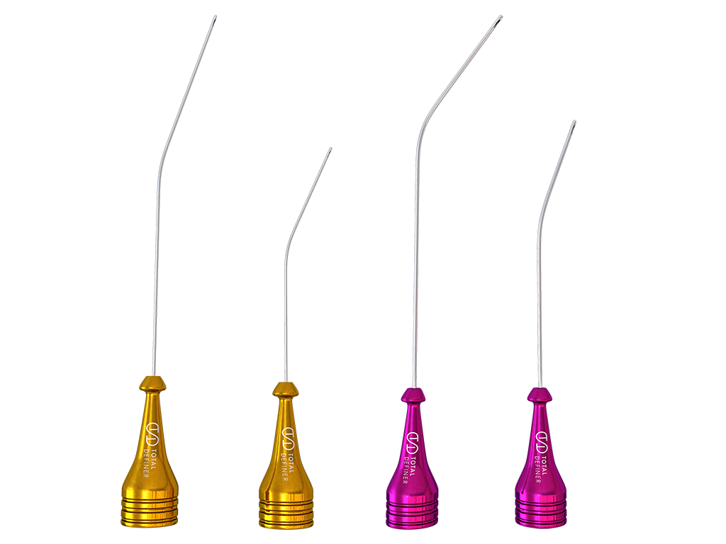 Lipoinjection cannulas specialized for fat transfer in different muscle groups, thus having a fundamental tool to carry out the High Definition Liposculpture technique. Different curvatures and angles that allow us to be dynamic when applying muscle definition.