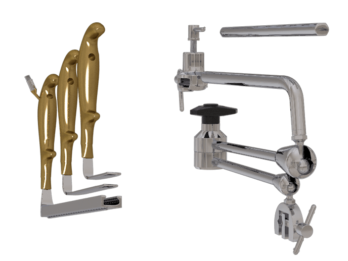 The retractor attaches to the surgical table and lifts the abdominal flap, crucial for a mini tummy tuck surgery, including a connector for a light source for enhanced visibility.